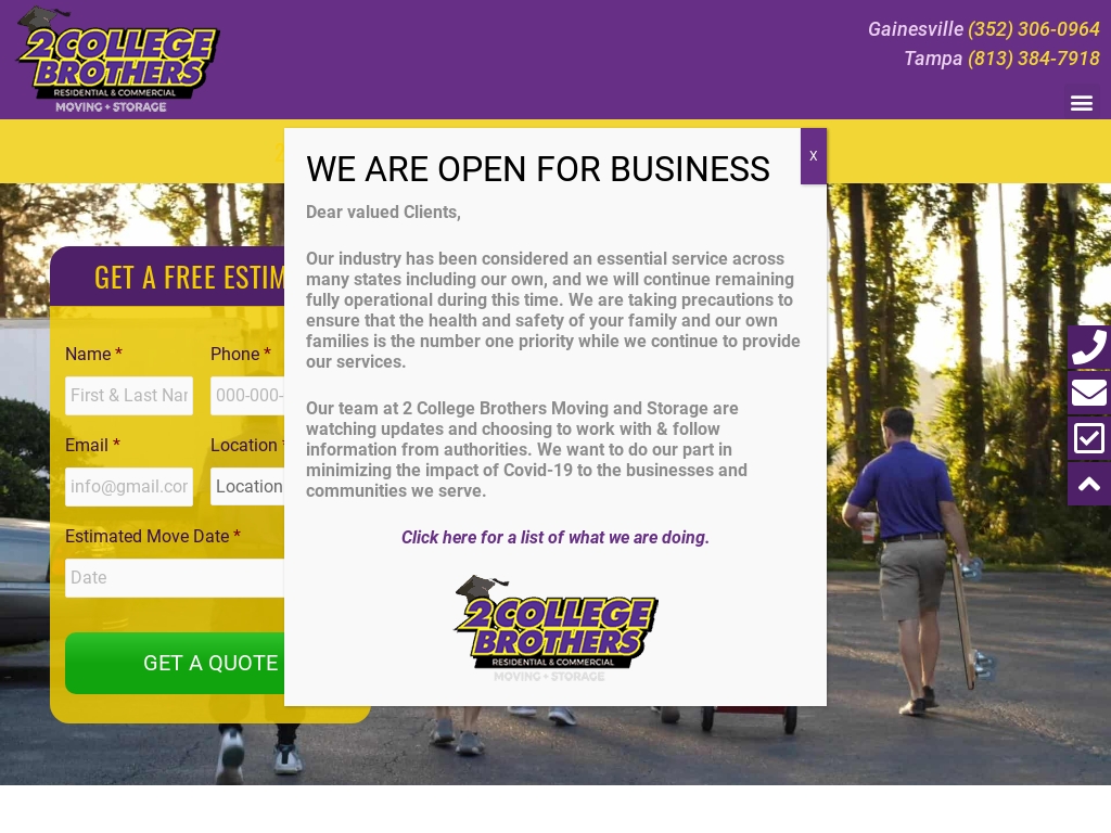 1 Tampa Gainesville Fl Movers 2 College Brothers Award Winning Tampa Gainesville Moving Company from 3pk3fek7pn44a04zi1blcn11-wpengine.netdna-ssl.com Read what they think about their salaries on 2 brothers moving & delivery's compensation faq page. Get directions, reviews and information for 2 college brothers moving & storage in gainesville, fl. To simplify the moving experience through reliable & friendly service. Get directions, reviews and information for 2 college brothers moving & storage in tampa, fl. Office movers in gainesville, fl. Was born to face a certain issue: Our gainesville movers are college students who represent integrity and professionalism. Search for other movers on the real yellow pages®.
